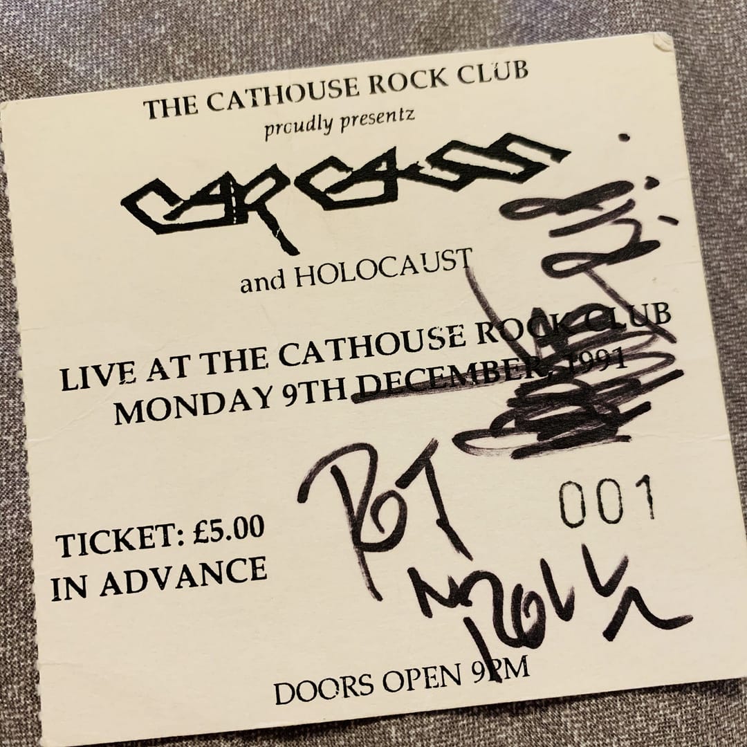 Ticket number one! Carcass live at the old Cathouse in Brown Street during their Necroticism tour in 91 – nearly 30 years ago! I remember this well as the great Bill Steer signed my plain black shirt after the gig with the slogan “Rot n’ Roll” across the chest and It became my favourite ever t-shirt.